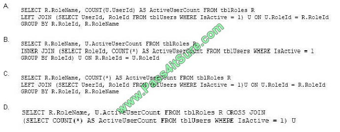 You need to create a count for active users in each role. If a role has no active users. You must display a zero as the